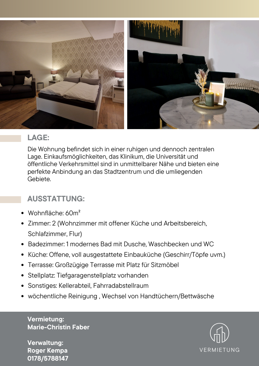 Dank meiner über 10-jährigen Erfahrung in der Kurzzeitvermietung profitieren Sie von einer professionellen, zuverlässigen Abwicklung sowie einem reibungslosen Ablauf für Ihr Unternehmen und Ihre Mitarbeiter.