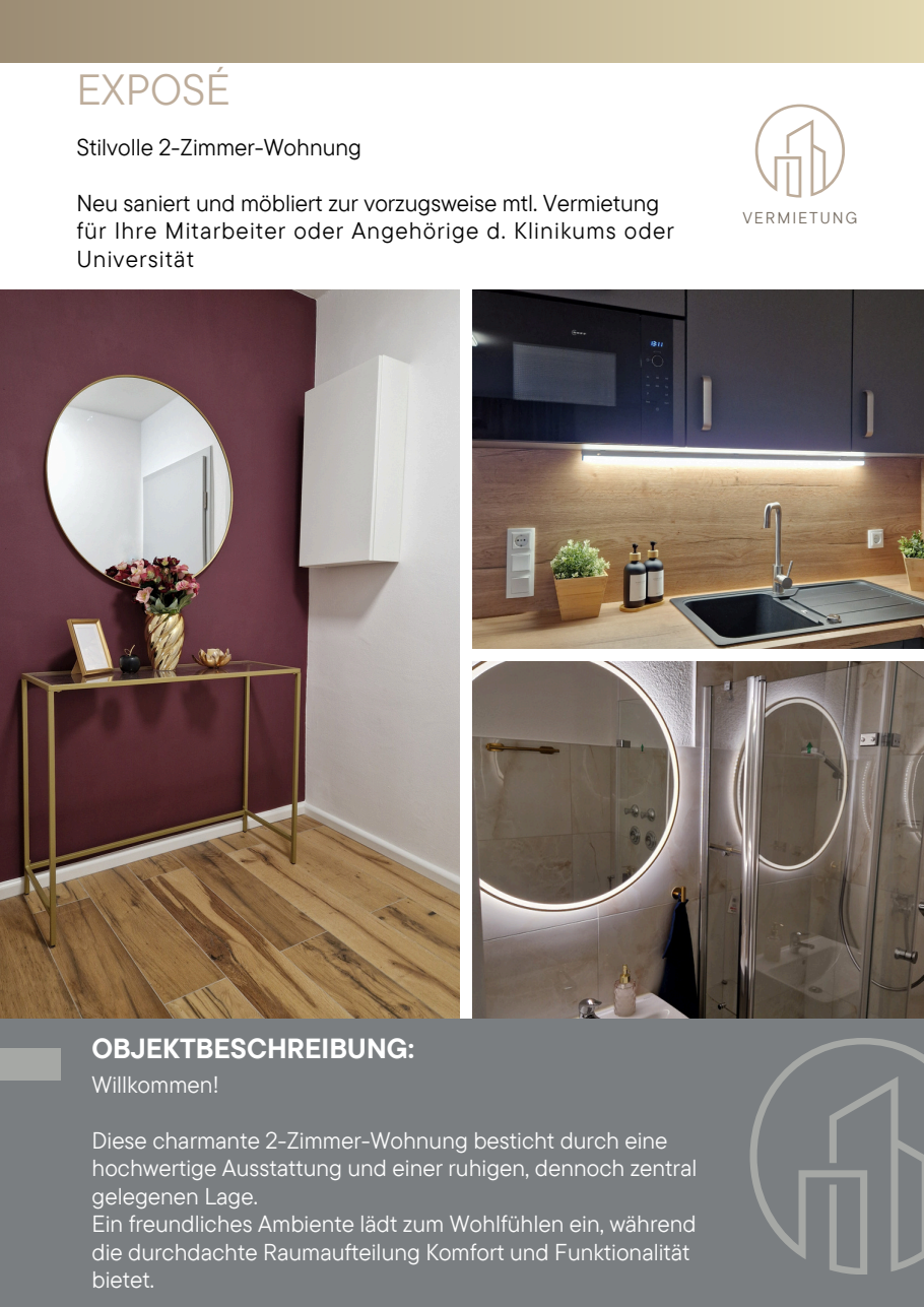 Die Wohnung eignet sich ideal für die Unterbringung von Projektmitarbeitern, Fachkräften oder externen Dienstleistern, die eine komfortable und sofort nutzbare Wohnlösung suchen.