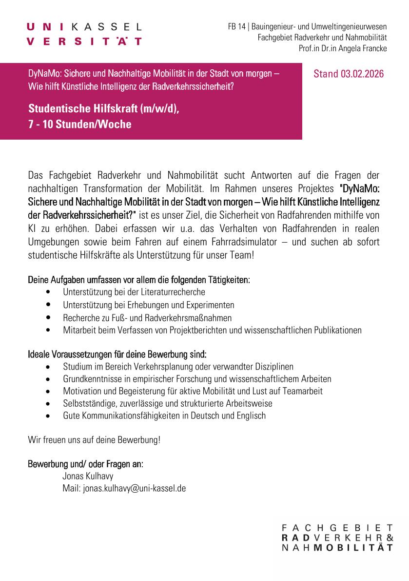 Das Fachgebiet Radverkehr und Nahmobilität sucht Antworten auf die Fragen der nachhaltigen Transformation der Mobilität. Im Rahmen unseres Projektes "DyNaMo: Sichere und Nachhaltige Mobilität in der Stadt von morgen – Wie hilft Künstliche Intelligenz der Radverkehrssicherheit?" ist es unser Ziel, die Sicherheit von Radfahrenden mithilfe von KI zu erhöhen. Dabei erfassen wir u.a. das Verhalten von Radfahrenden in realen Umgebungen sowie beim Fahren auf einem Fahrradsimulator – und suchen ab sofort studentische Hilfskräfte als Unterstützung für unser Team!